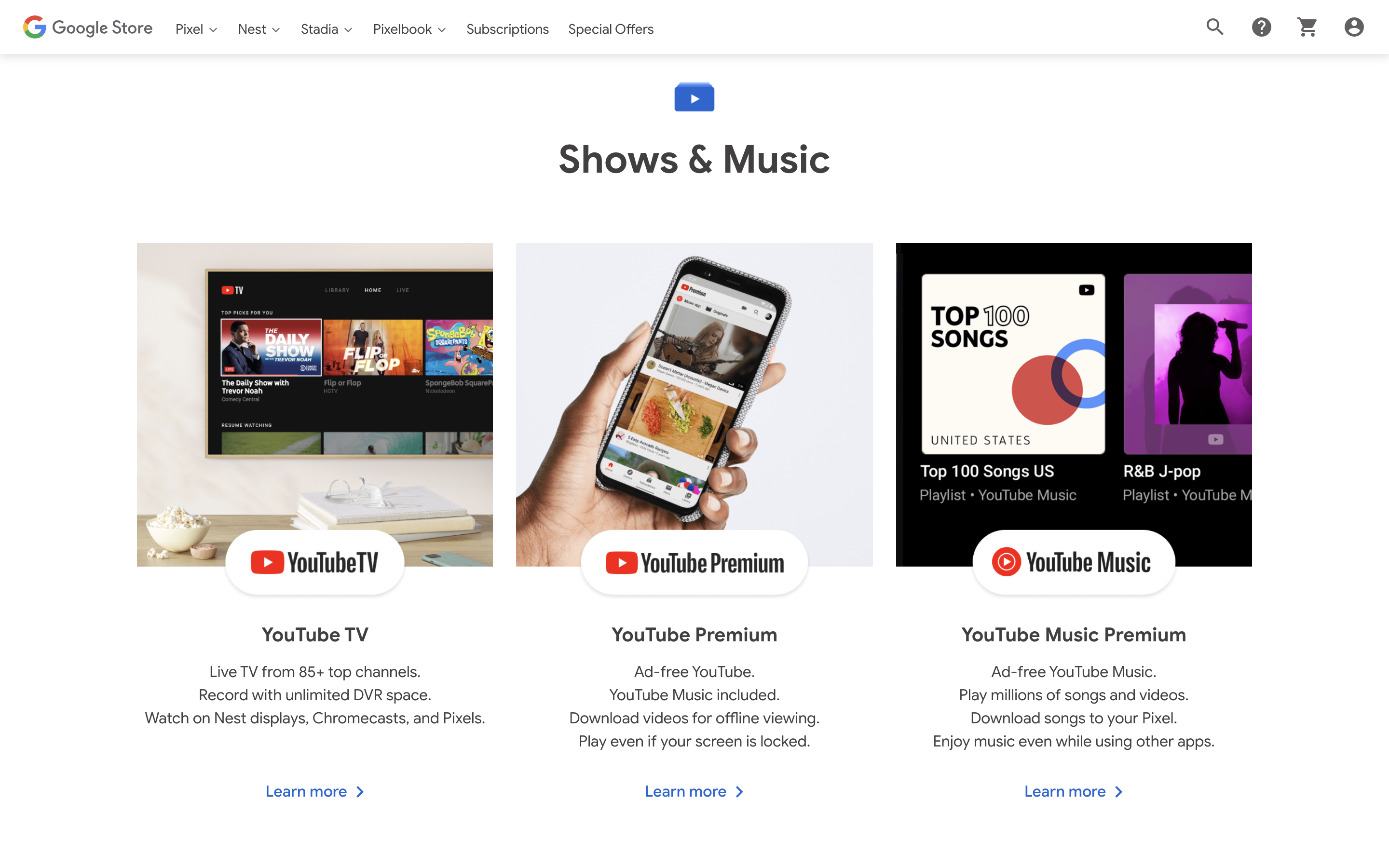 - Shows & Music: YouTube TV, YouTube Premium, YouTube Music Premium,
