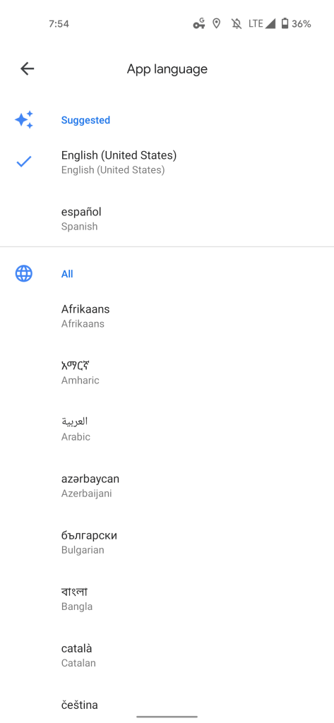 A “Suggested” section notes common alternative choices, while a list of “All” languages follows. There are 79 in total, with Google asking to confirm the change. This followed by an app restart as the language pick is quickly downloaded in the background.