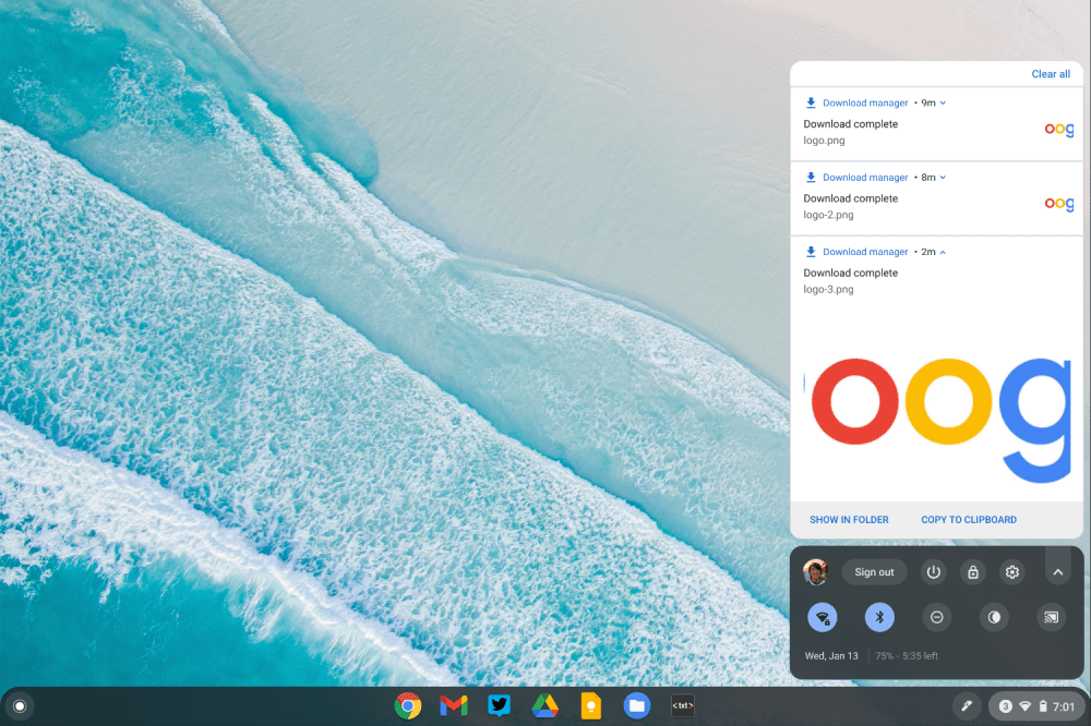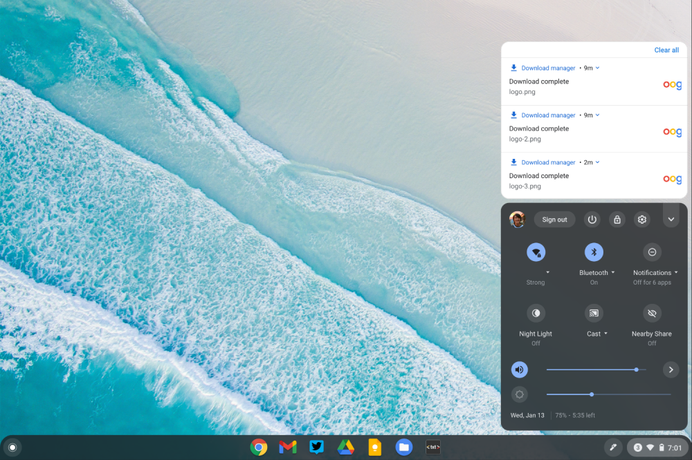 Another key similarity to the Chromebook experience is how “Notifications” are displayed in cards just above Quick settings with “Clear all” in the top-right.