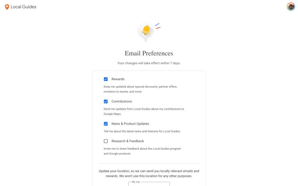 - Update your location for a more relevant Local Guides experience: Today, we send you locally relevant emails and rewards based on the city selection you made when you first joined the program.