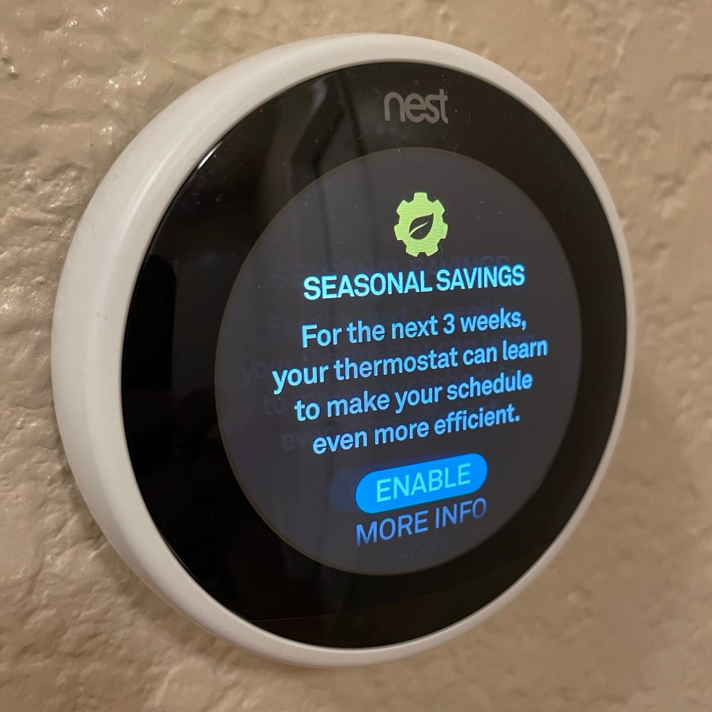 Over the past week, Google has been prompting users about Winter Seasonal Savings in the Nest app and on their Thermostats through a leaf-in-gear icon. The on-device message has three options: Enable, More Info, and No thanks: