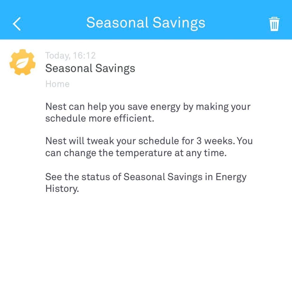 Google first recommends manually adjusting the temperature if Seasonal Savings don’t match your preferences. This gives the Thermostat a chance to adapt: