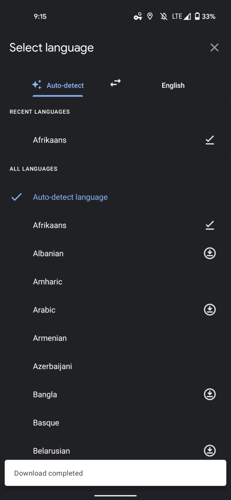 Open the Translate filter and click the “pairing” pill underneath “Google Lens” to open a “Select language” screen. On first launch, you’ll notice a “Tap to download” prompt highlighting a new button next to most languages.