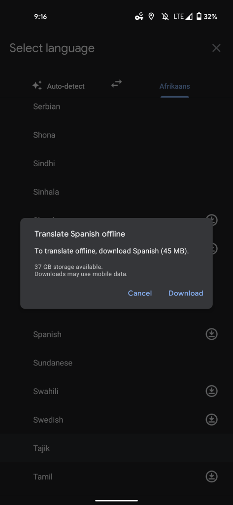 Before proceeding, Google will note how big the offline language pack is and what storage remains on your device. A checkmark appears on that main list once the download completes, while another tap removes the file.