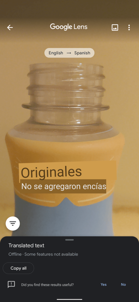 Similar to the “Instant” camera in Google Translate, this offline Lens feature works even before you hit the shutter button to capture a still shot. Results are overlaid on the live preview to preserve the context of what’s being translated. The bottom sheet will note how the translation occurred offline and that “some features [were] not available.” There’s a button to “Copy all,” but there’s no ability to select individual lines of text like when you’re connected.