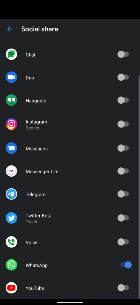 Up to three user-selected applications can appear in that menu. A list appears in Google Camera settings to toggle on/off your desired share targets.