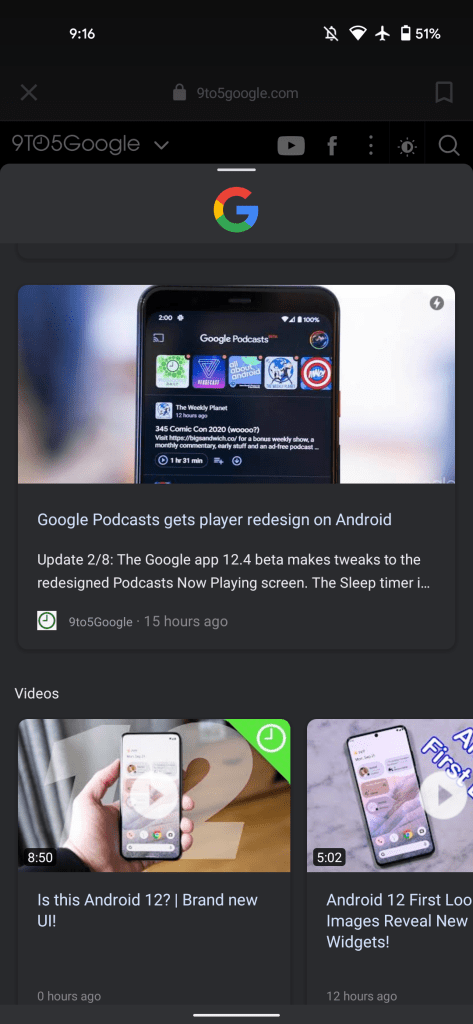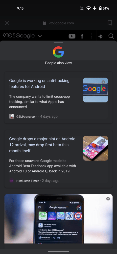 Update 2/9: This in-app browser redesign is getting a significant feature that lets users swipe up on the bottom bar with a new pull tab. This slides open a “People also view” sheet that features the Google logo up top and shows a feed of articles and videos related to the Discover or Search link you opened. Some content features full-width cards, while carousels are also present.