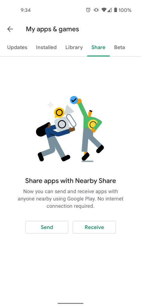To get started with Nearby Sharing, open the Google Play Store, tap the three-line menu button in the top corner, then tap “My apps & games.” On this page, you should see a handful of tabs along the top, one of which should say “Share.” If you don’t see the Share tab, try waiting a few minutes, as we found it can take a bit of time for the Play Store to enable the feature after the update.