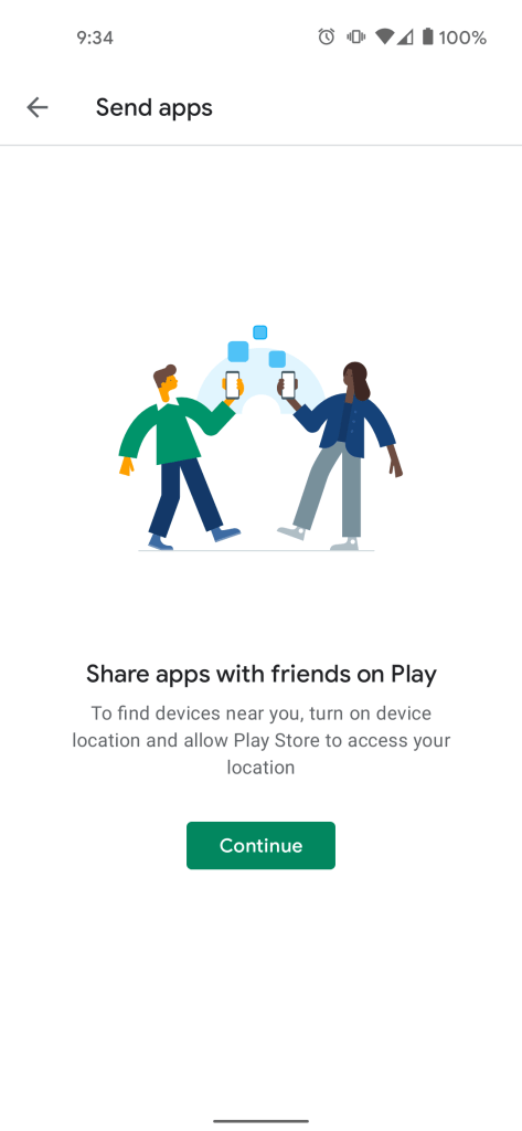 On the Play Store’s new Share tab, you have the option to let your device either “Send” or “Receive” a particular Play Store app. Regardless of which option you choose, you’ll need to give the Play Store access to your location, which is used to determine which devices are nearby for sharing.