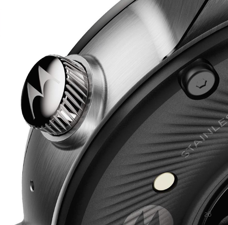 The heart rate sensor looks to be mostly the same, but the underside is transparent to reveal a charging coil that implies Moto could be moving away from pogo pins to wireless power. Other small tweaks see the crown with vertical — instead of curled — grooves, while there are visible screws securing the watch straps.