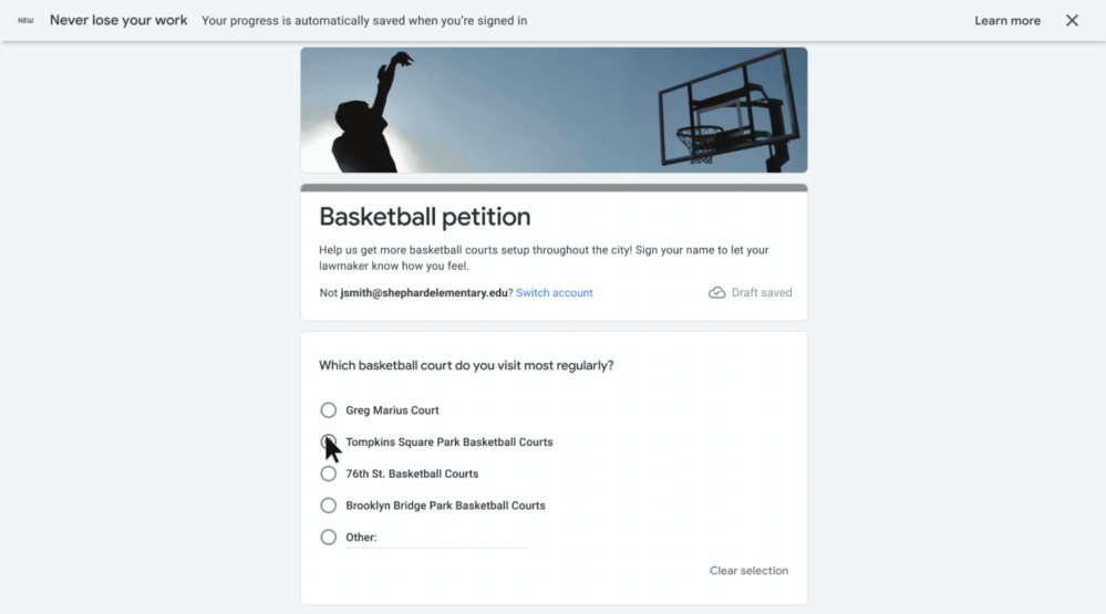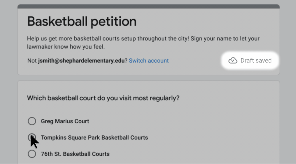 Note that during the beta, Forms will only automatically save your progress as a draft for users in your domain when they’re signed in to their Google Workspace for Education account.