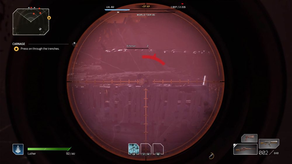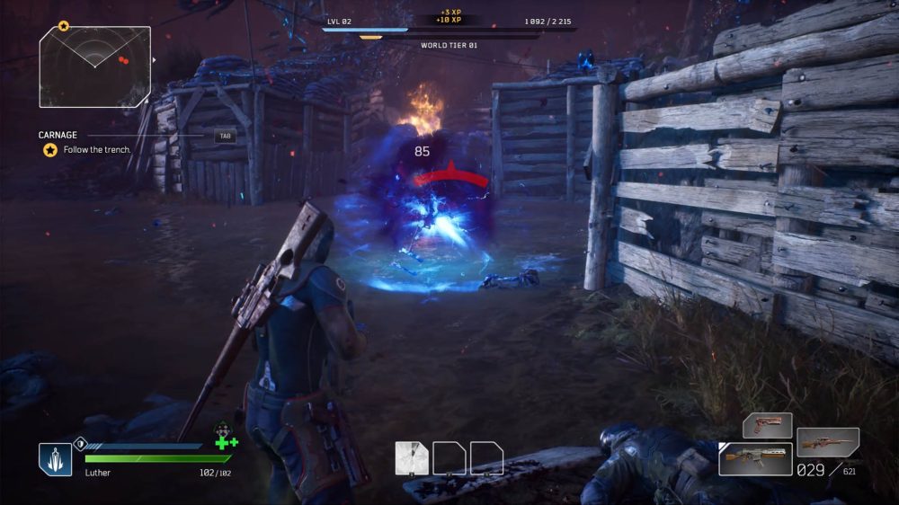 The variety of guns has me wanting to try approaching different sections at odds with how I would usually play many looter shooters. I’m not saying expect gunplay to be as varied as say Borderlands 2 or 3, but each gun class does feel like it has advantages and disadvantages. I’ve grown very accustomed to one of the early game sniper rifles and it’s really satisfying to pull off headshots when an enemy pops up from behind cover. The dialled up gore really does help hammer home the differences in each of your weapons, with lumps of flesh flying when pummeling enemies with clip after clip.