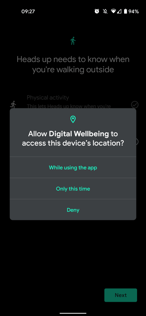 As you can see from the setup screens below, when launching the dedicated Digital Wellbeing app, the Heads Up mode needs to be manually activated. Naturally, you’ll need to allow location and physical activity access to be set to “Allow all the time” before it can work correctly:
