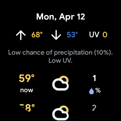 Original 4/8: Today, there is only a “Weather” complication that shows the current condition and temperature. The one for UV index is similarly styled and matches all other small complication styles. Opening the full Weather app currently provides high/low, precipitation chance, and forecast for a few hours into the future.