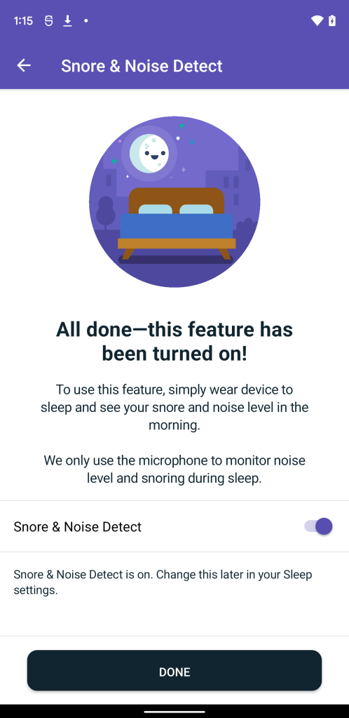 As of today, “Snore & Noise Detect” is not widely available to use in the Fitbit app, but we were able to briefly enable the feature to at least set it up, though we’ve not yet been able to fully test it.