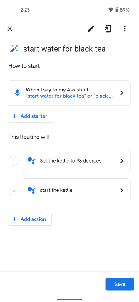 “But wait,” I thought, “there must be a better way.” And there is! In the Google Home app, you can set up custom routines for the Assistant to perform when asked. Knowing there are only a handful of things I use a kettle for — french press coffee, black tea, and green tea — I set out to create a routine for each of them.