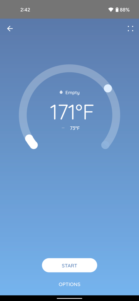 Once connected, you’ll handle your day-to-day kettle needs through the Smarter app, which offers a simple thermostat-like interface showing the current water temperature and the one you’re seeking. Simply drag your finger along the arc to your preferred temperature and tap “Start” to get heating. While everyone has their preferences, I would have liked to see the app offer some presets for common drink brewing temperatures.