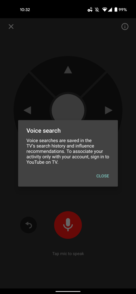 With the latter option, you have a new panel with options to adjust volume, start voice search, and open “remote,” which is a straightforward D-Pad with a back button. For those that like navigating large-screen experiences with a simple remote, this is a great improvement over having to still use the YouTube phone app when watching on a television.