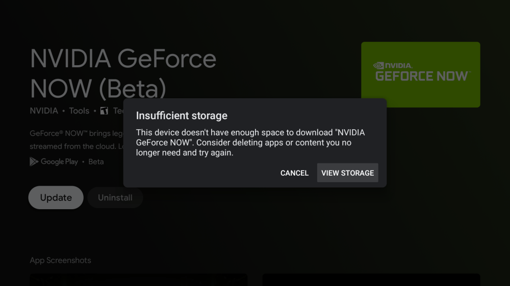 Between these and a few small apps I use for work to copy files from my phone to the TV and vice versa, there is essentially no storage space left on my Chromecast with Google TV. Just today, I tried to install the latest update to GeForce NOW but was instead greeted with an unwelcome error message: