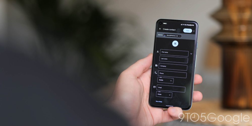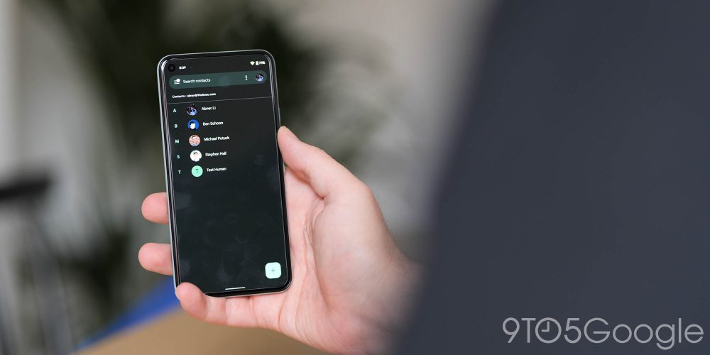 As far as first-party apps go, Google Contacts is the first to see what we’d consider a sizeable Material You redesign. It starts with a pill-shaped search field up top that replaces the previous rounded rectangle shape. This element, along with the background and a non-circular FAB that is much more raised with a prominent shadow, adapts to your Dynamic Color.
