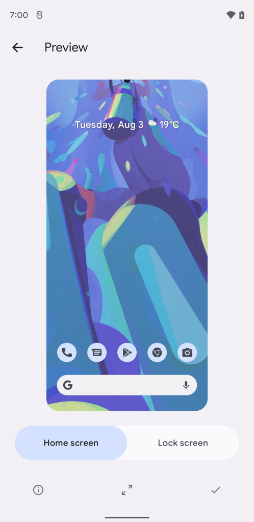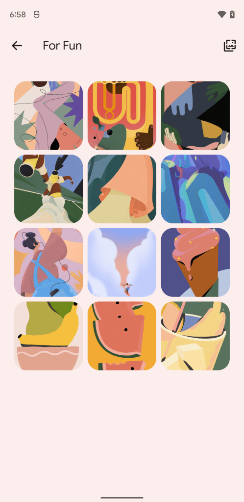 By pretending to use the Pixel 6 Pro, our team was able to get the built-in wallpaper picker to offer the official collection of “For Fun” wallpapers that will be offered on Google’s phones this fall. There are 12 wallpapers in total, each one cleverly designed to hide the now-centered hole punch.