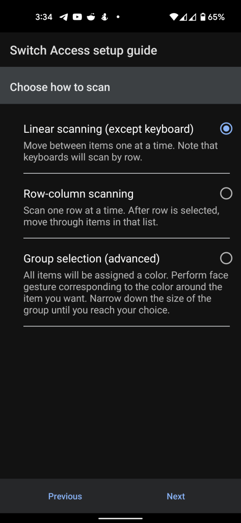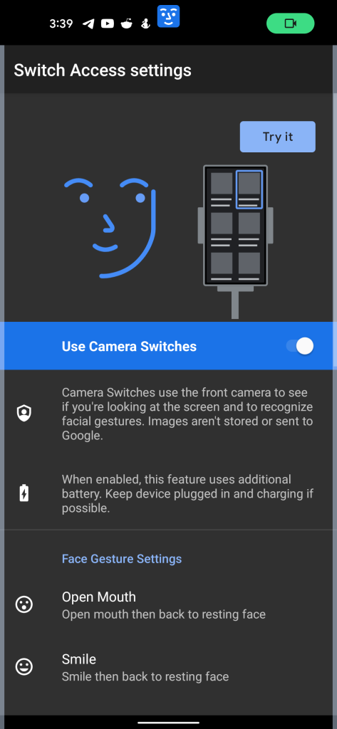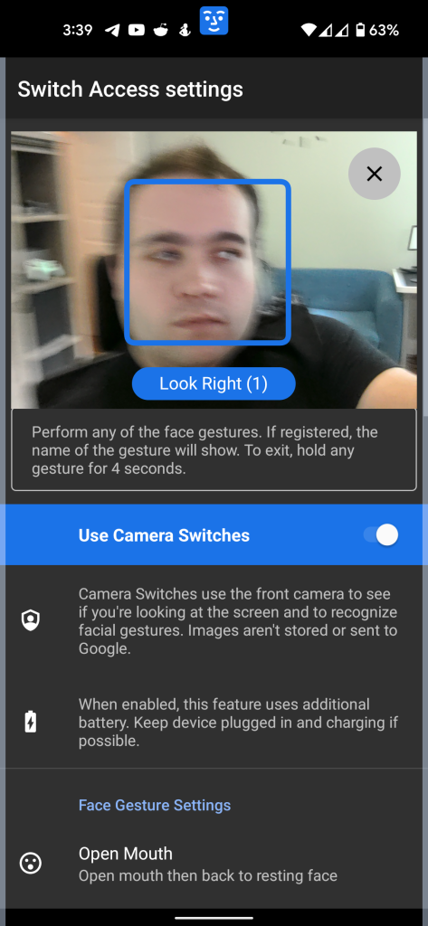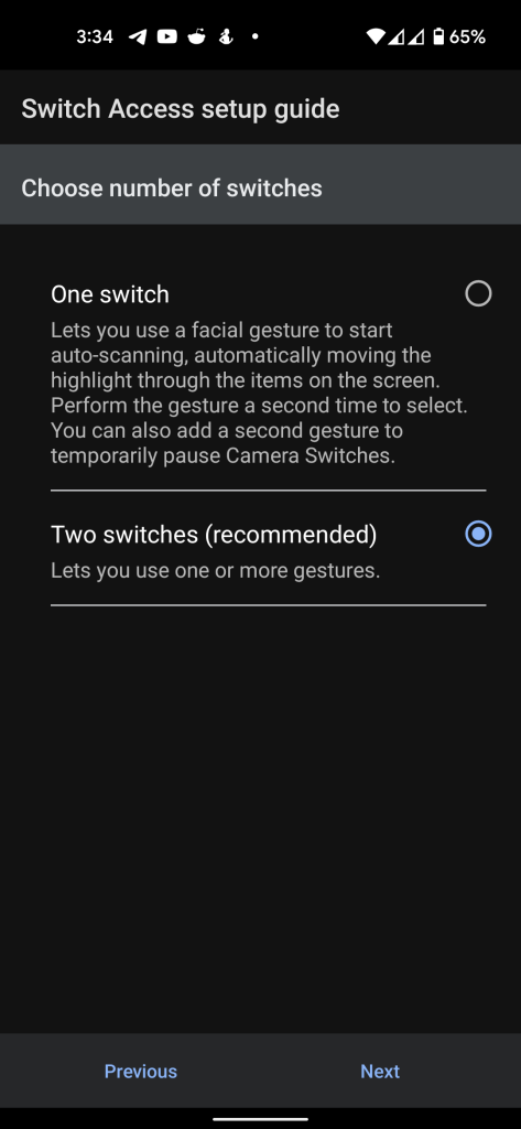 This feature, which is live now for Android 12 owners, allows users to pick from one or two switches. The first uses one gesture to “scan” and that same gesture to select that target. The two switch option allows users to set multiple facial expressions to match up with Android actions.