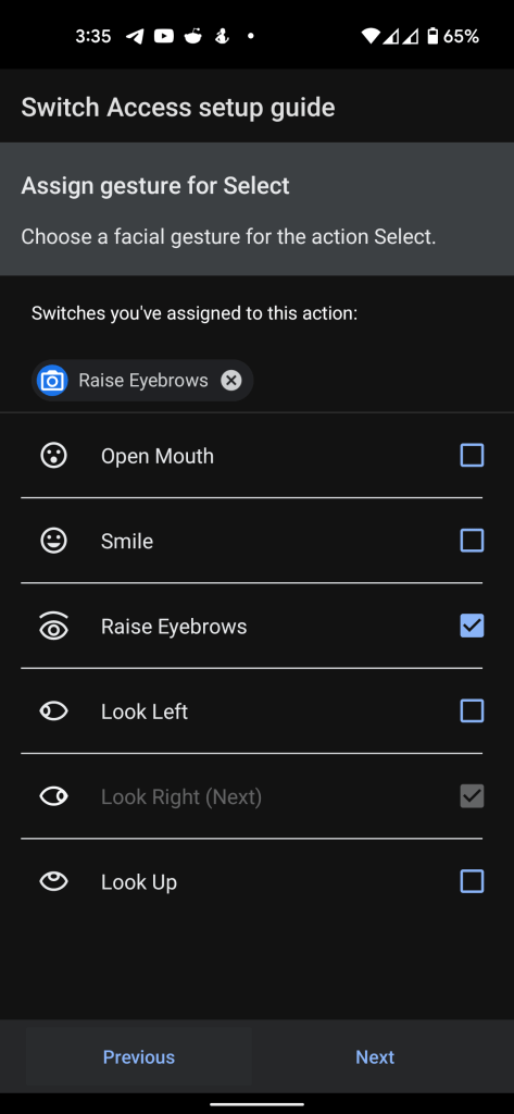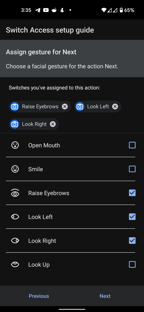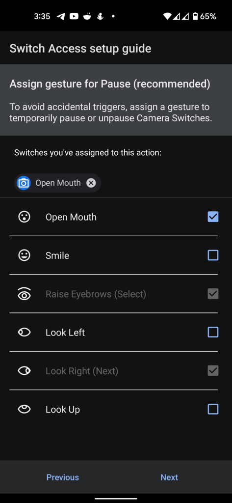 The facial expressions that can be performed include opening your mouth, smiling, raising your eyebrows, and looking left, right, or up. The feature will, by default, ask for the user to set expressions for next, select, and “pause,” which stops the phone from recognizing other gestures temporarily. Other actions include previous, touch & hold, scroll forward/backward, home, back, notifications, quick settings, and overview/multitasking.