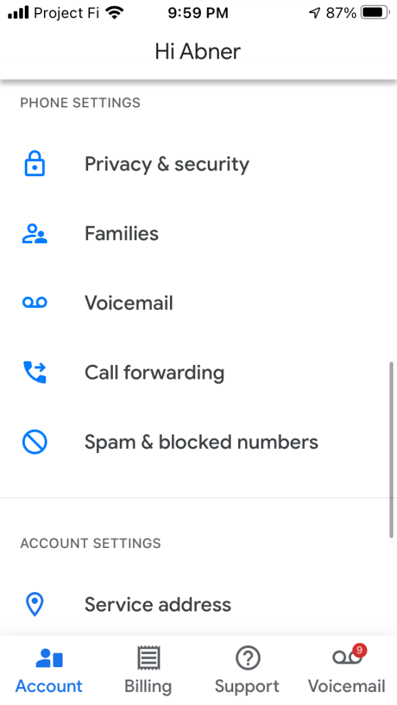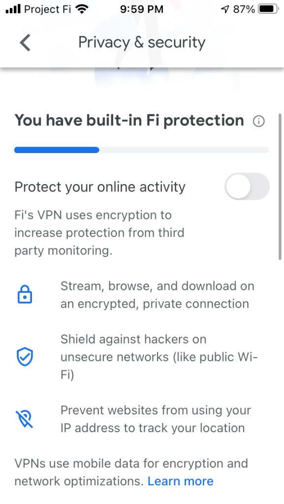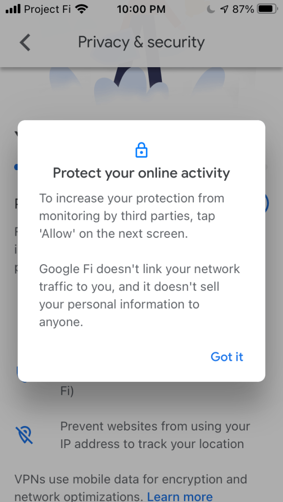 Update 8/21: As of this week, the Google Fi VPN is widely available for iPhone users. Once rolled out, there is a new “Privacy & section” menu under Phone Settings in the main Account tab.