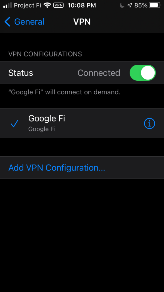 After that, you’ll see a VPN icon in the status bar. Users can enable/disable from either the Google Fi app or Settings app > General > VPN.