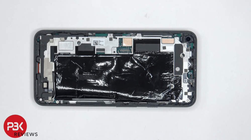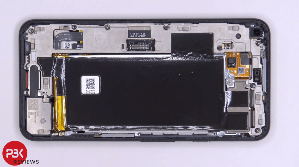 The teardown from PBKreviews starts by showing how the display assembly features clips, just like the Pixel 5, in addition to glue. Once the panel is removed — which fortunately does not have a boxy under-display speaker component — we see a similar layout, down to the graphene film. There is no midframe construction with components attached directly to the rear casing rather than a middle board on the 4a and 4a 5G.