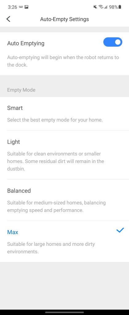 Once set up, the vacuum will run as normal and, when cleaning is complete, head back to the dock to empty its internal dustbin. This produces a lot of noise, so if you plan to schedule the vacuum to run overnight or early in the morning, just keep in mind it will almost definitely wake up light sleepers. In terms of noise, it wasn’t any louder than the auto-empty dock on a Shark vacuum I tried, as pictured below.