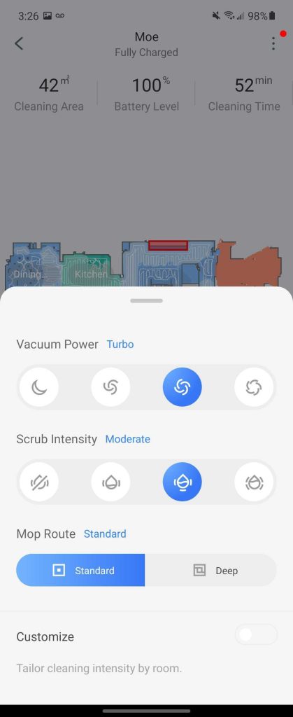 The app makes it easy to set off the S7 on a run through your home or a specific room, too. Just pick a space, hit “clean,” and let it get to work. You can also adjust the vacuum’s power and the mop’s “scrub intensity” based on how you want cleaning to go. Typically speaking, I left the vacuum on “Turbo” and the mop on “moderate” and was fairly happy with the results.