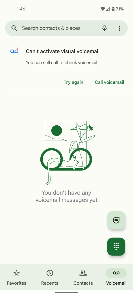The most noticeable change is to the app’s bottom navigation bar, which now includes a pill-shaped indicator of which tab you’re on, a design choice that is distinct to Material You. Similarly, the two floating buttons — one used to open the dialer, the other a shortcut to Duo — changed from a circle to a rounded square. This same change can be seen in most of Google’s newly redesigned Workspace apps.