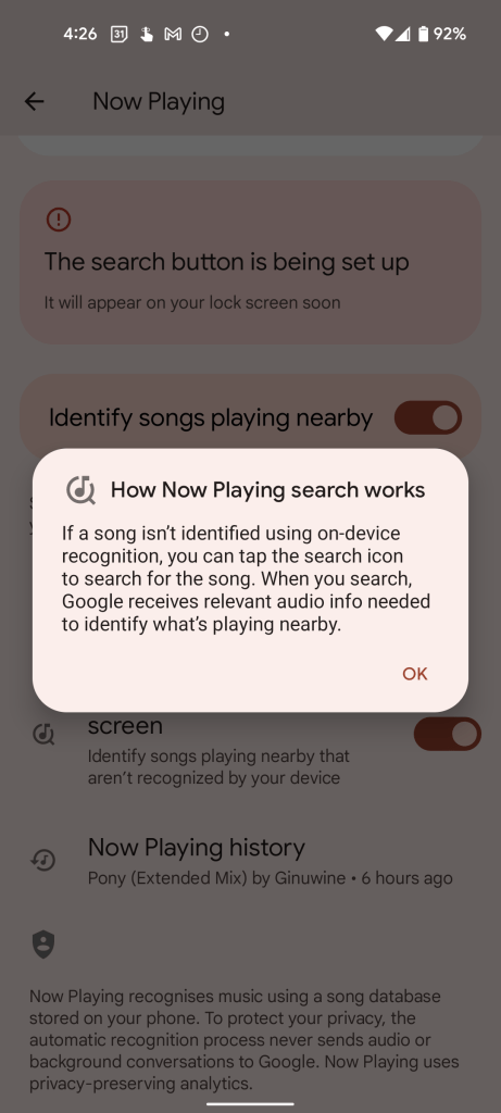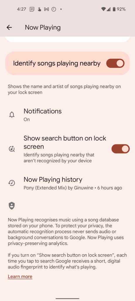 Normally, Now Playing on Pixel phones uses an on-device database to “fingerprint” a song being played nearby, allowing the feature to work while offline and more importantly not send your recordings to Google without active consent. Of course, the world has a great wealth of music, the “fingerprints” for which cannot all be simultaneously stored on your device, so Now Playing has a relatively narrow knowledge base of songs that you’re likely to want to be identified.