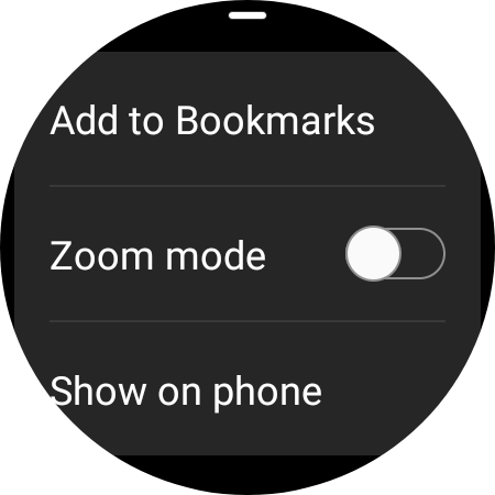 An obvious question about a web browser on your wrist is how exactly that tiny, circular display can manage to show full webpages. Samsung’s answer is with gestures. A guide will come up when you navigate to your first webpage that explains a diagonal swipe from either side of the screen will allow users to get to the corners of a webpage. Meanwhile, a swipe up reveals options for bookmarks, “Zoom mode,” and a shortcut to send the webpage directly to your connected phone.