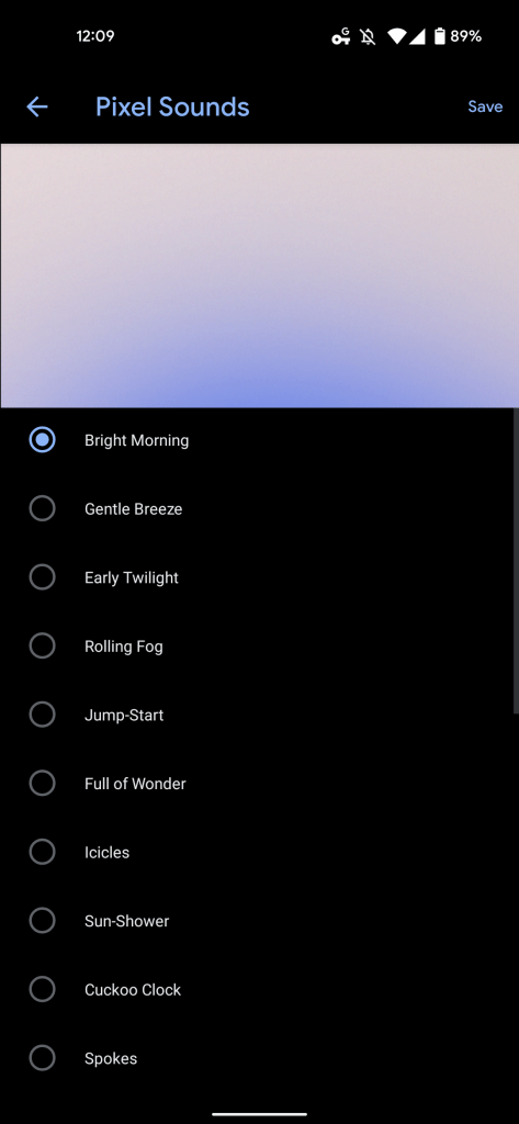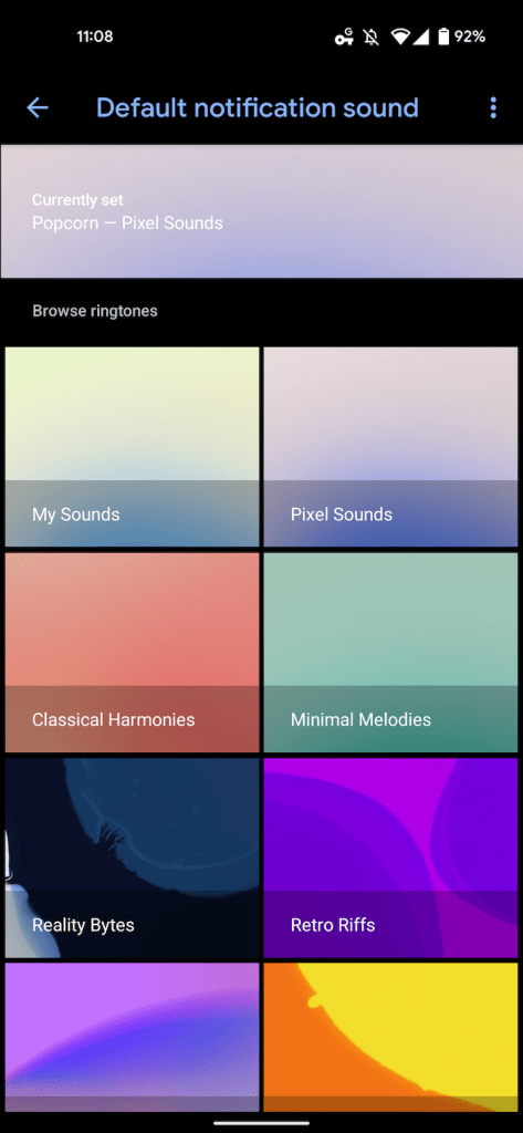 What’s “Currently set” is displayed at the top, and that’s followed by nine collections in total: My Sounds, Pixel Sounds, Material Adventures, Classical Harmonies, Minimal Melodies, Reality Bytes, Retro Riffs, Play It Loud, and Seasonal Celebrations.