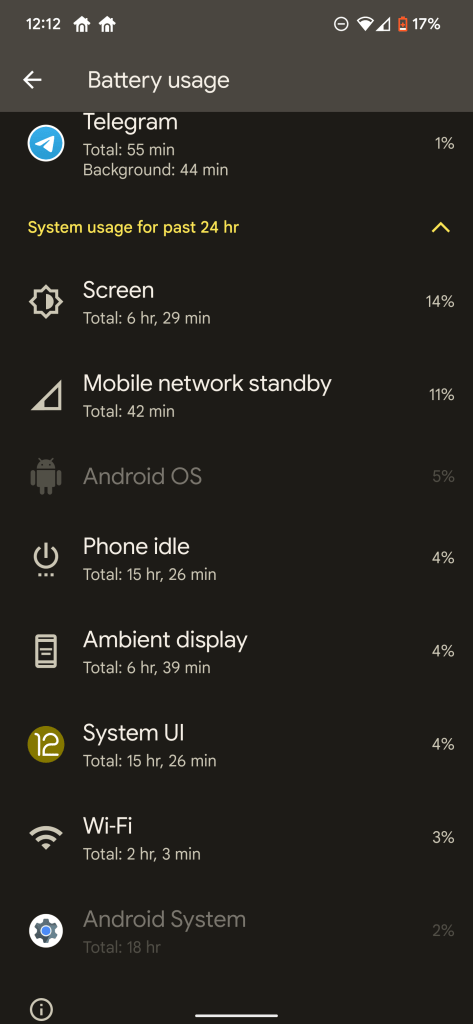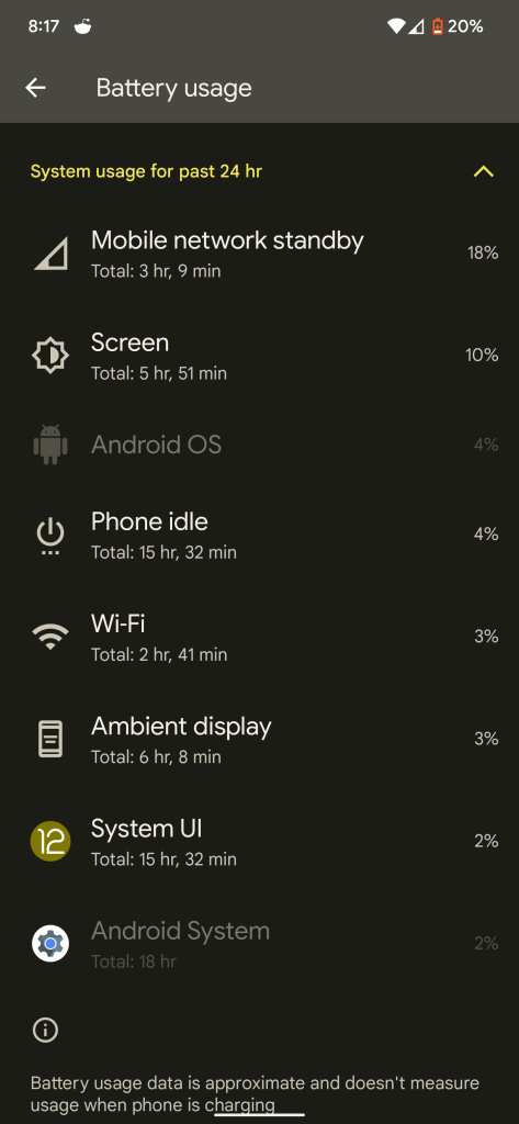 Google is advertising the 5,000 mAh battery in the Pixel 6 Pro as lasting “all-day” and, in my use so far, that certainly seems accurate. Over this early testing, I’ve had the Pro easily coast from around 8 a.m. to around 11 p.m. without needing a charger. Generally, I go to bed at 11 p.m. or later, and the phone is under 15%, but I consider that solid endurance, all things considered. My use has not been light, either, with screen-on-time ranging from three hours to six hours easily getting me through the day without any battery anxiety. Notably, though, Android 12’s battery screen changes make it very difficult to accurately track these stats between charges, so my figures may be slightly off.