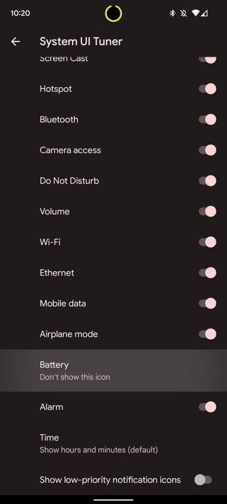 First, download the app and turn on the functionality; you’ll need to give the app accessibility permissions, which it will prompt you to do. From there, you can turn off the normal battery indicator by going to Settings > Battery > Percentage. You can toggle off the battery percentage readout on this screen, and to take the visual makeover a step further, you can go to Android’s built-in “System UI Tuner.” This is most easily accessed using this app and, once launched, you can simply turn off the battery icon.