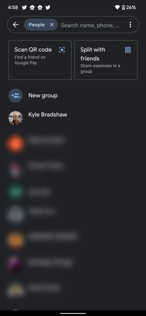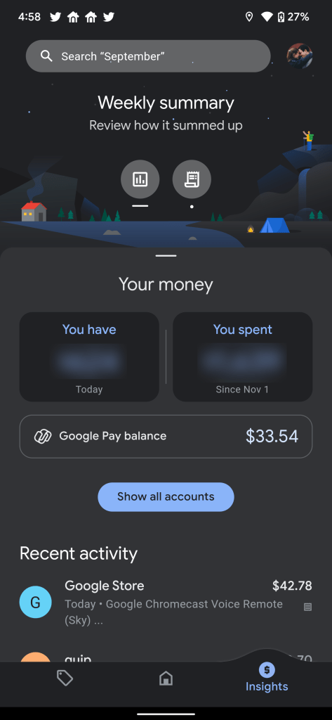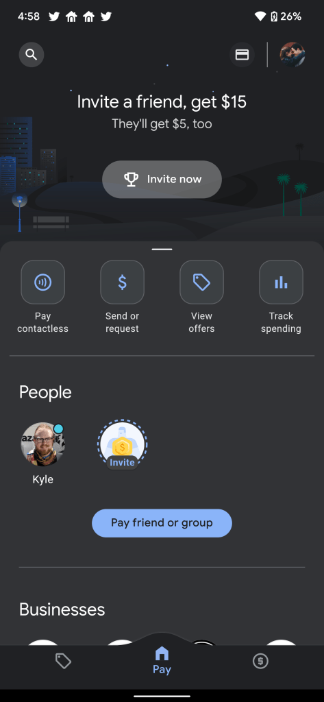 The next shortcut goes to the send/request money page, another option that’s available lower on the UI. “View offers” goes to the left-hand tab, while “Track spending” jumps over to the right tab. These shortcuts are all redundant, which leads us to believe they exist solely to help make the features easier to find and understand.