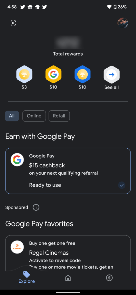 Seemingly rolling out on an account-by-account basis – we’re able to consistently see the menu on one account, but not others – this new shortcut menu appears on the app’s main tab and offers four shortcuts to common parts of the Google Pay app.