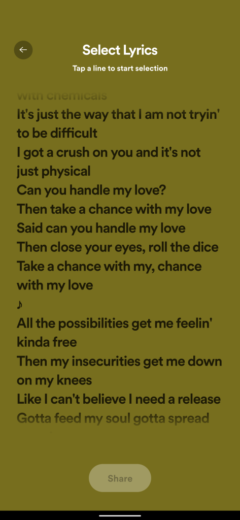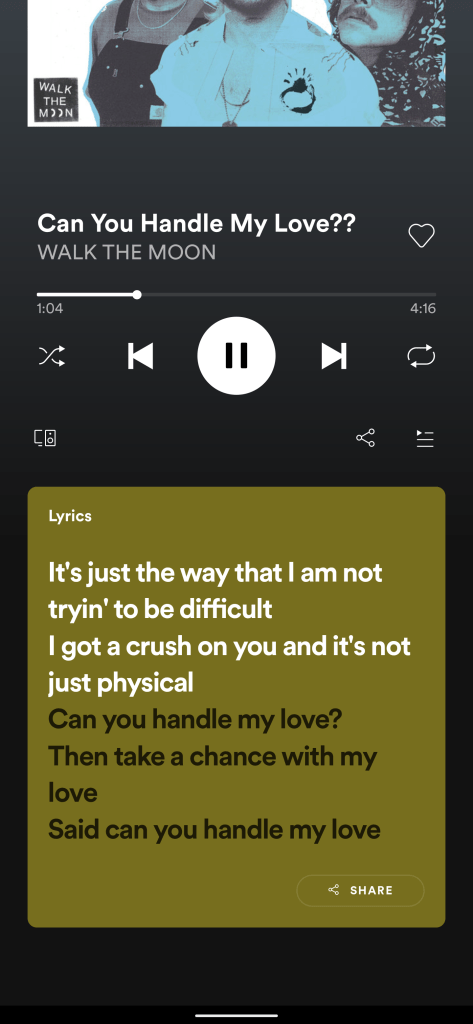 Viewing lyrics on a mobile device shows a scrolling card that has the current lyrics highlighted. You can also share the lyrics as an image.
