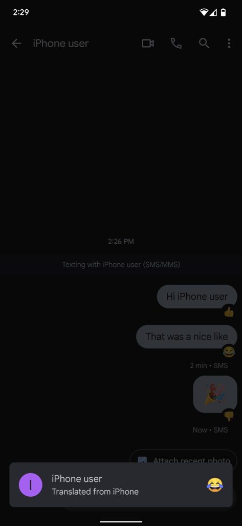 Importantly, the fallback messages do not appear in the message history, keeping things uncluttered. When you tap on a message’s reaction, Google Messages will show that it was “Translated from iPhone,” which is genuinely a humorous way of putting it.