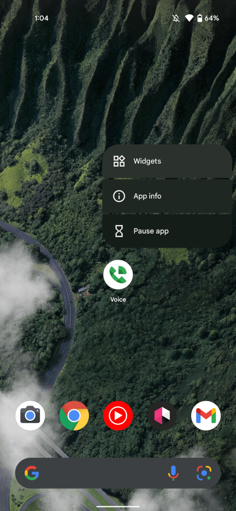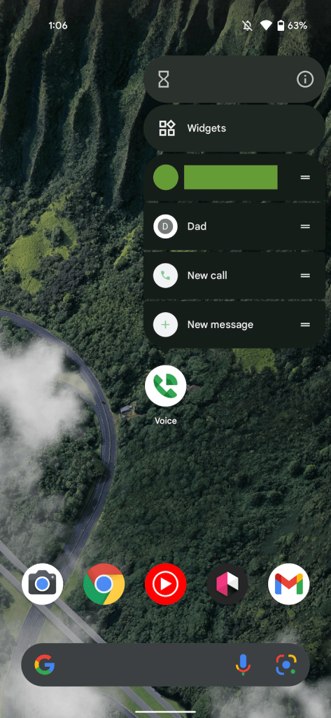 Version 2021.11.15.411104209 of Google Voice for Android introduces up to four shortcuts when long-pressing the app icon. Previously, Android would just note the standard availability of “Widgets,” “App info,” and “Pause app.”