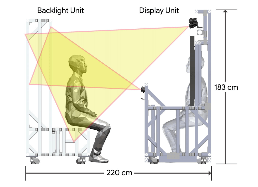 The rig starts with a 65-inch 8K panel that operates at 60Hz. Google says this “screen-based system is motivated in part by the significant weight and discomfort associated with most current AR and VR headsets,” which have low angular resolution and field of view.