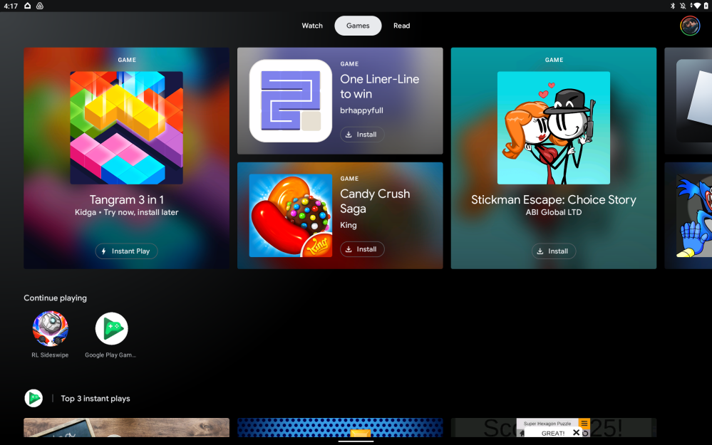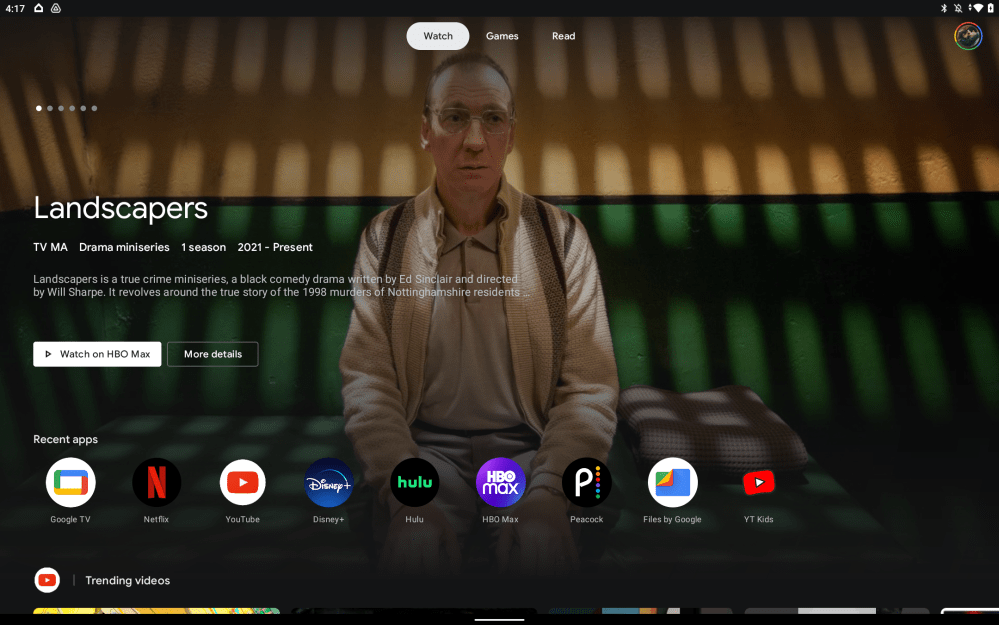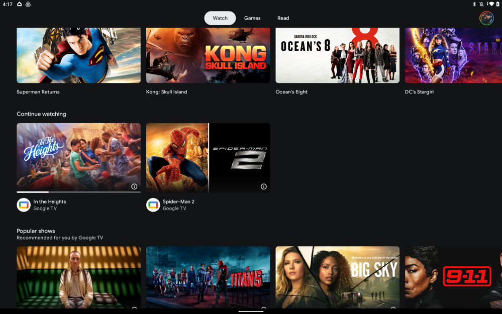 Google Entertainment Space is designed with three tabs – Watch, Games, and Read. Each section is self-explanatory, and the first feels the most useful to me. Built on the same ideas as Google TV, the Watch tab has a carousel of movie and TV show recommendations at the top, but only content recommendations. Unlike Google TV, there are no ads here.