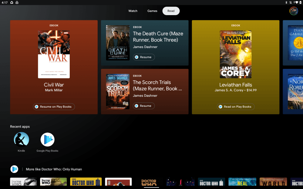 And finally, there’s the Read tab. This could have a lot of uses with downloaded media, apps for study, and simply various sources of reading. Tech News, for example, seems like a no-brainer. Unfortunately, this is also underused. Google Play Books, a service that is 11 years old as of today, is really the only thing that integrates. The page will show apps including Kindle in the row, but recommendations for content come almost solely from Play Books.