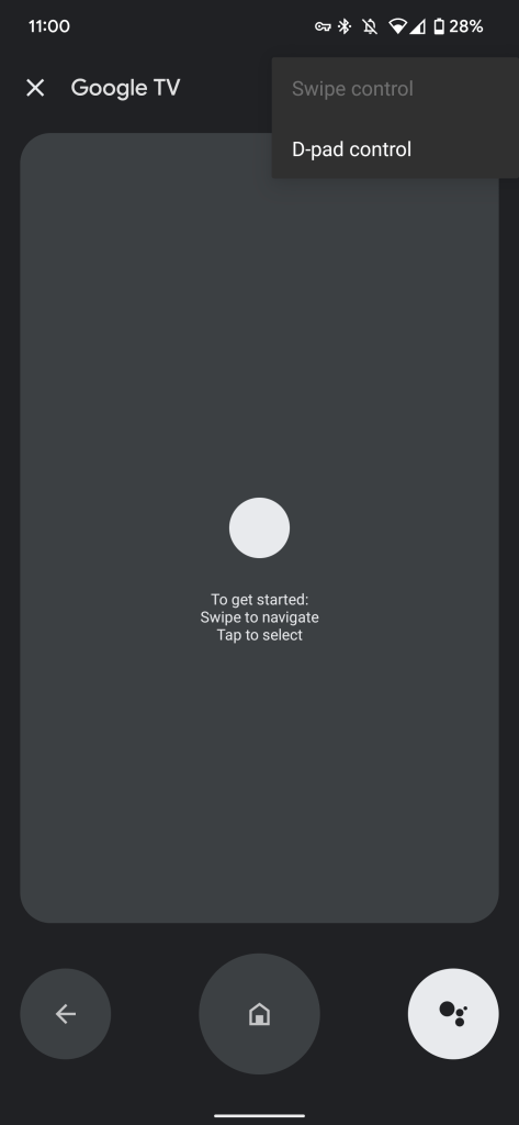 Tapping the upper-right three-dot kebab menu offers up the “D-pad control” option when you are paired to an existing Android TV or Google TV device. Given that the swipe controls can feel less intuitive and prone to lag or input delay, a more traditional d-pad option is great to have access to: