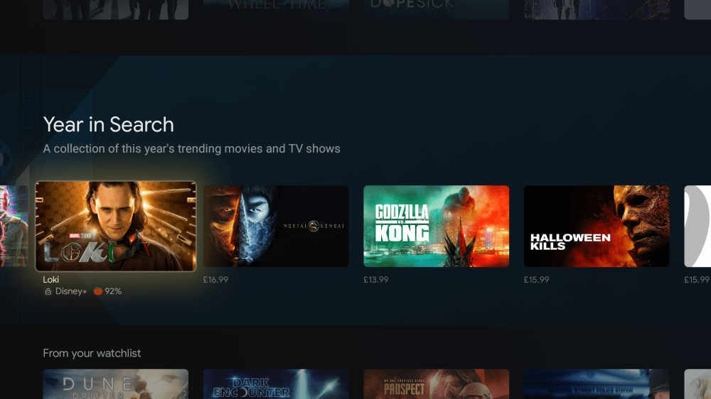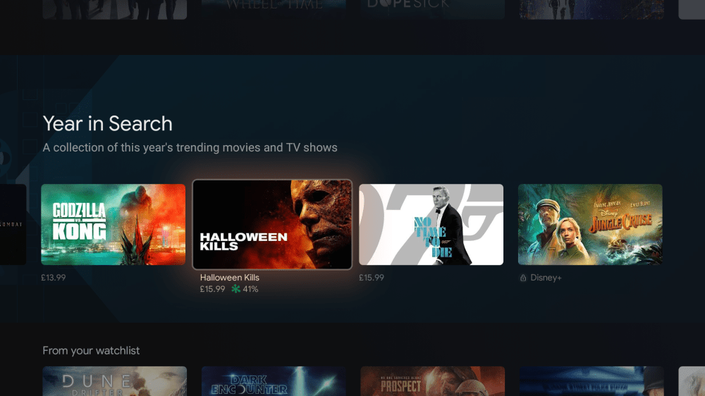 Available today, Chromecast with Google TV users should now see prominent “Year in Search” playlists appear on their home screens. The main playlist is “Year in Search: A Collection of This Year’s Trending Movies.” This list includes the top trending movies throughout 2021 including: