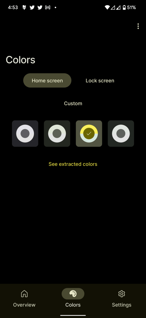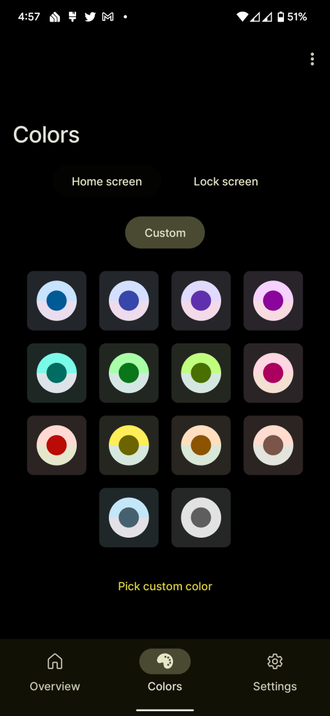 By default, Android 12 on Pixel phones will pull a collection of accent colors from your wallpaper(s). Generally, you’ll get three to four options with a primary accent along with some other, muted options. These colors are usually pastel in nature, meaning they’re a bit muted. You can still create some stunning looks, but there’s an inherent lack of control with this system in its default state.
