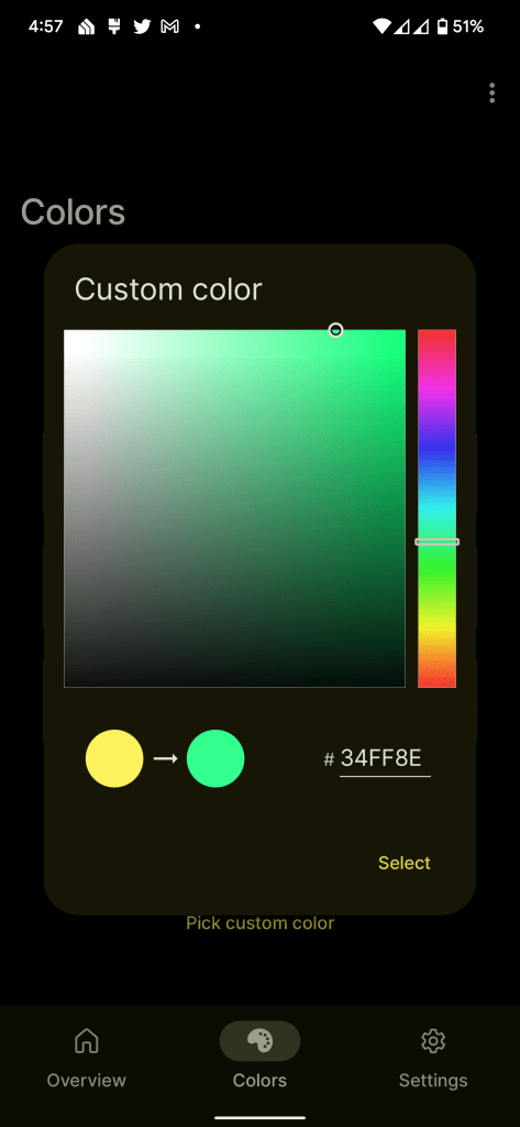 The app defaults to what Android 12 already picks out, but you can easily change it to any custom color palette — there’s even a HEX color picker!